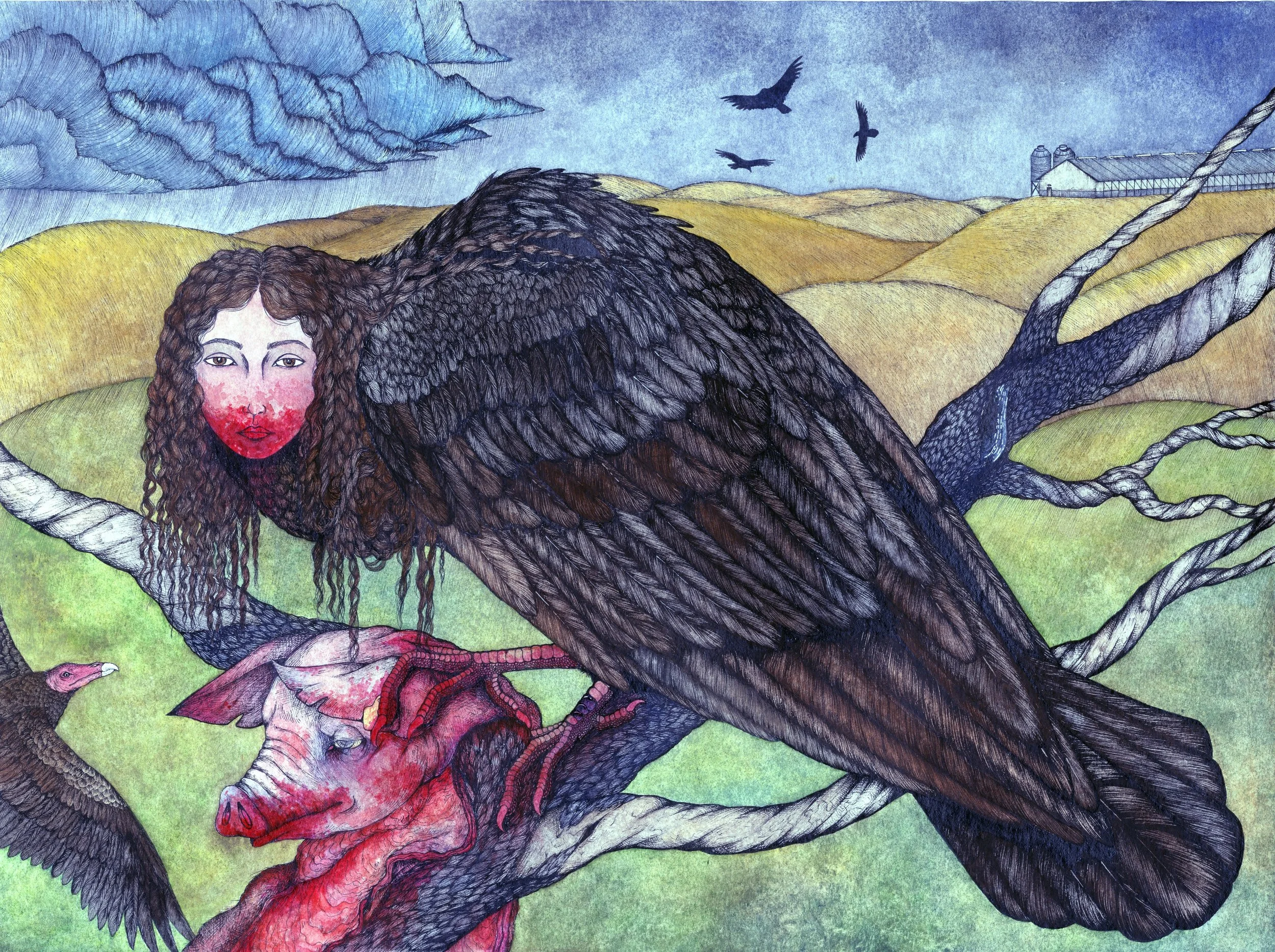 In my Relation to the Vulture, Pen & Watercolor, 9”x13”, 2019
