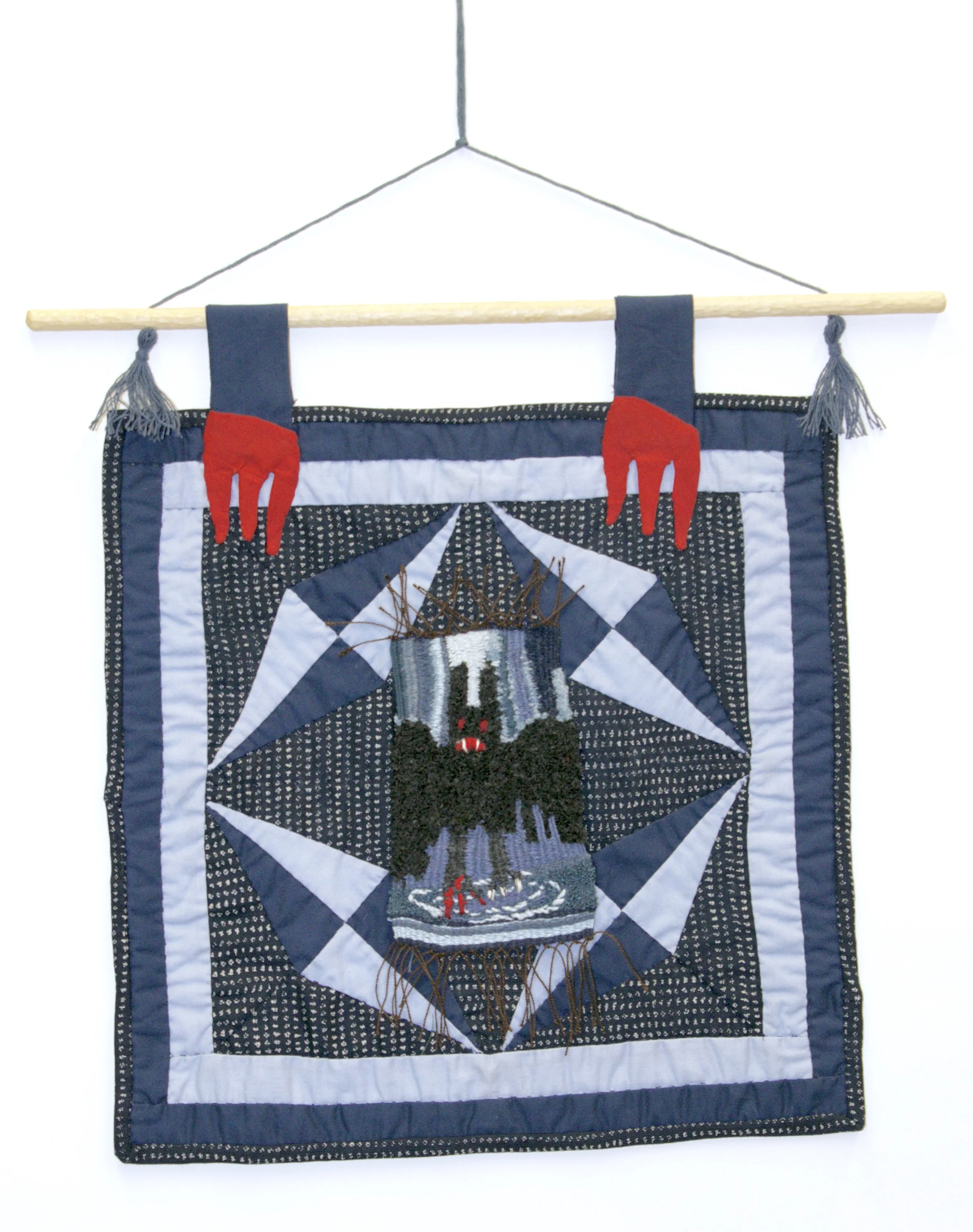 An Exploration of experimenting with textile materials and combining different textile techniques such as weaving, quilting, and embroidery. The intertwining of these elements creates a narrative, a platform on which I use to create my stories inspired by myths in America and from other folklore from across the sea. The creatures in my work have been warped, changed and altered. They are a combination of different retellings of stories.